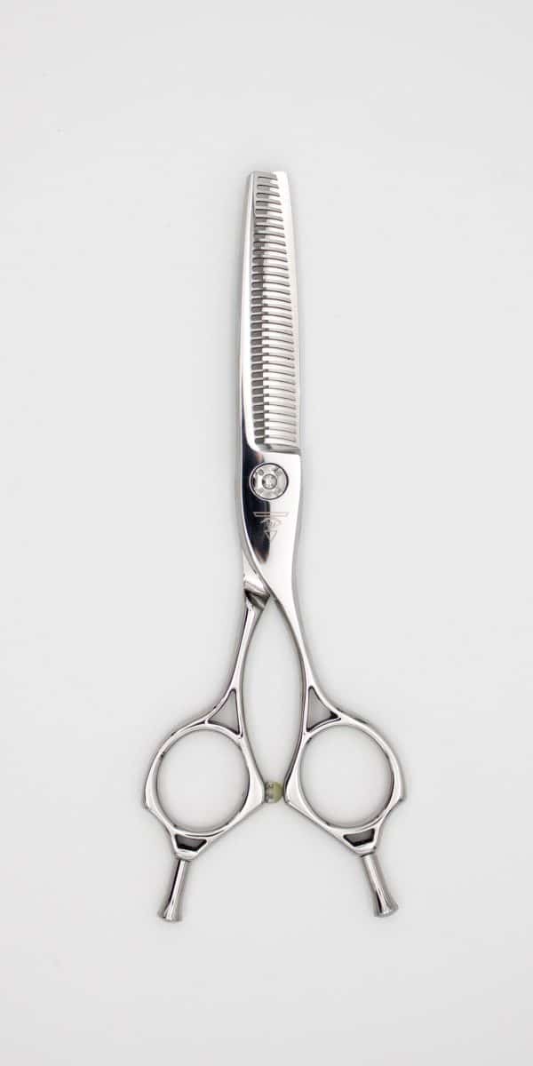 33目2段櫛刃セニングです。より圴一な量が取れるようになり、更に切口が小さくラインが出にくくなります。鋼材はパウダースチールにしたことで耐久性が上がったほか、サクサクな切れ味になり、リズム感が強くなり微妙な感触も技術者に伝わりやすくなりました。量のバランスを素早く調整、仕上げの最終調整は最適です。ウェット状態も使いやすいです。